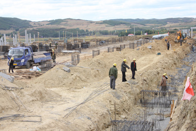 在牡丹江市郊東北、G11國道西側,有一處破土動(dòng)工的工業(yè)園區,這里彩旗招展,機械隆隆,此地就是牡丹江市對俄經(jīng)濟開(kāi)發(fā)區光伏產(chǎn)業(yè)園區建設現場(chǎng),數家施工企業(yè)在這塊十幾萬(wàn)平方公里的戰場(chǎng)上相互比拼。由我公司承建的光伏園區8號標準化廠(chǎng)房,正以前所未有的速度加緊施工。該工程建筑面積為20880平方米,于2011年8月15日開(kāi)工。